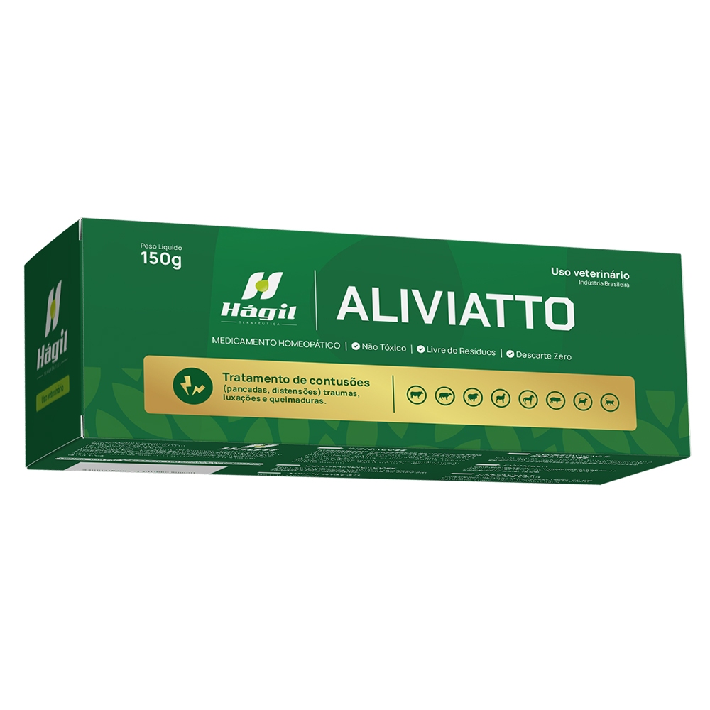 O Aliviatto é um produto para uso tópico, indicado para reduzir inflamações, inchaço e dores associados a contusões ou torções. Além disso, proporciona alívio e estimula o processo cicatrização na pele. Excelente para uso em contusões, cortes, queimaduras, escoriações e luxações. Excelente para acelerar a cicatrização das marcas a ferro quente em animais de corte.